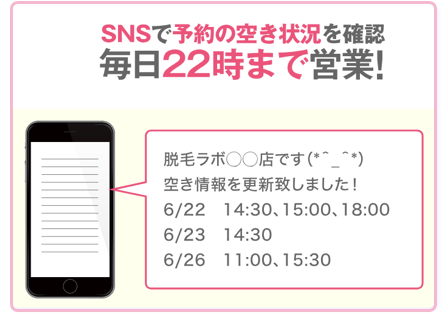 しかし、脱毛ラボは、LINEでリアルタイムの空き状況を確認できそのまま予約もできるので、空き枠を見つけたらすぐに予約することができます。