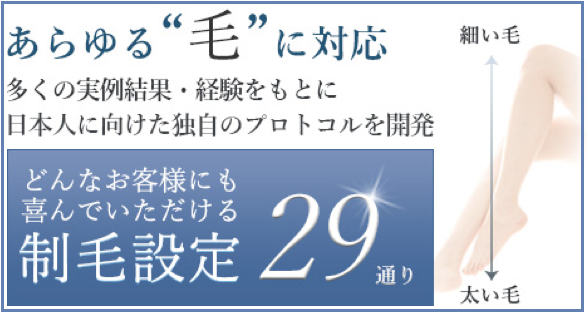 しかも、細い毛から太い毛までどんな毛でも脱毛できるように制毛設定が29通りもあるんです。産毛から剛毛まで対応しているので、脱毛効果がとっても高くなっています!